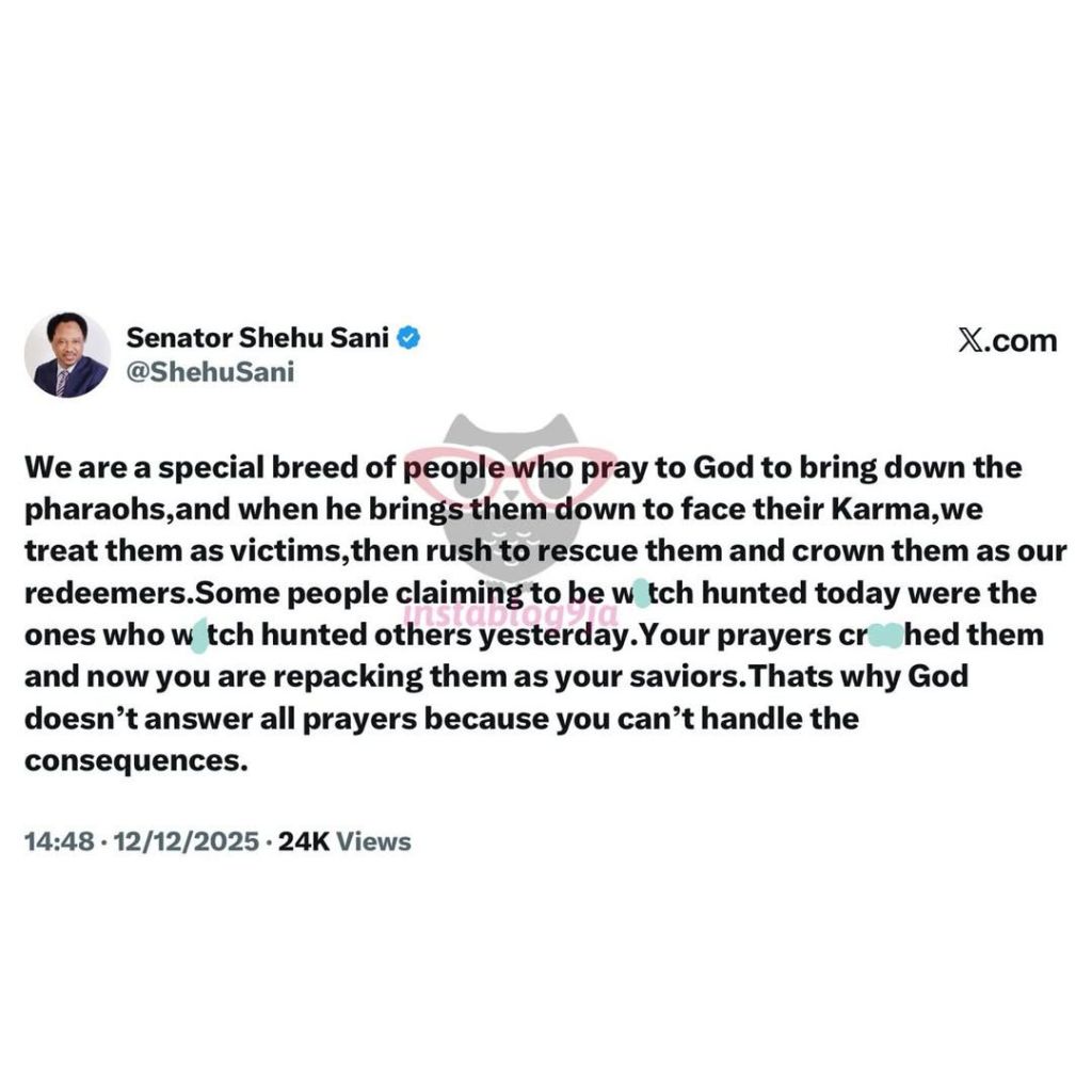 In the post, Sani said many pray for strong rulers to fall. He added that when power shifts, the same people show pity. He warned that this habit weakens justice and moral balance.