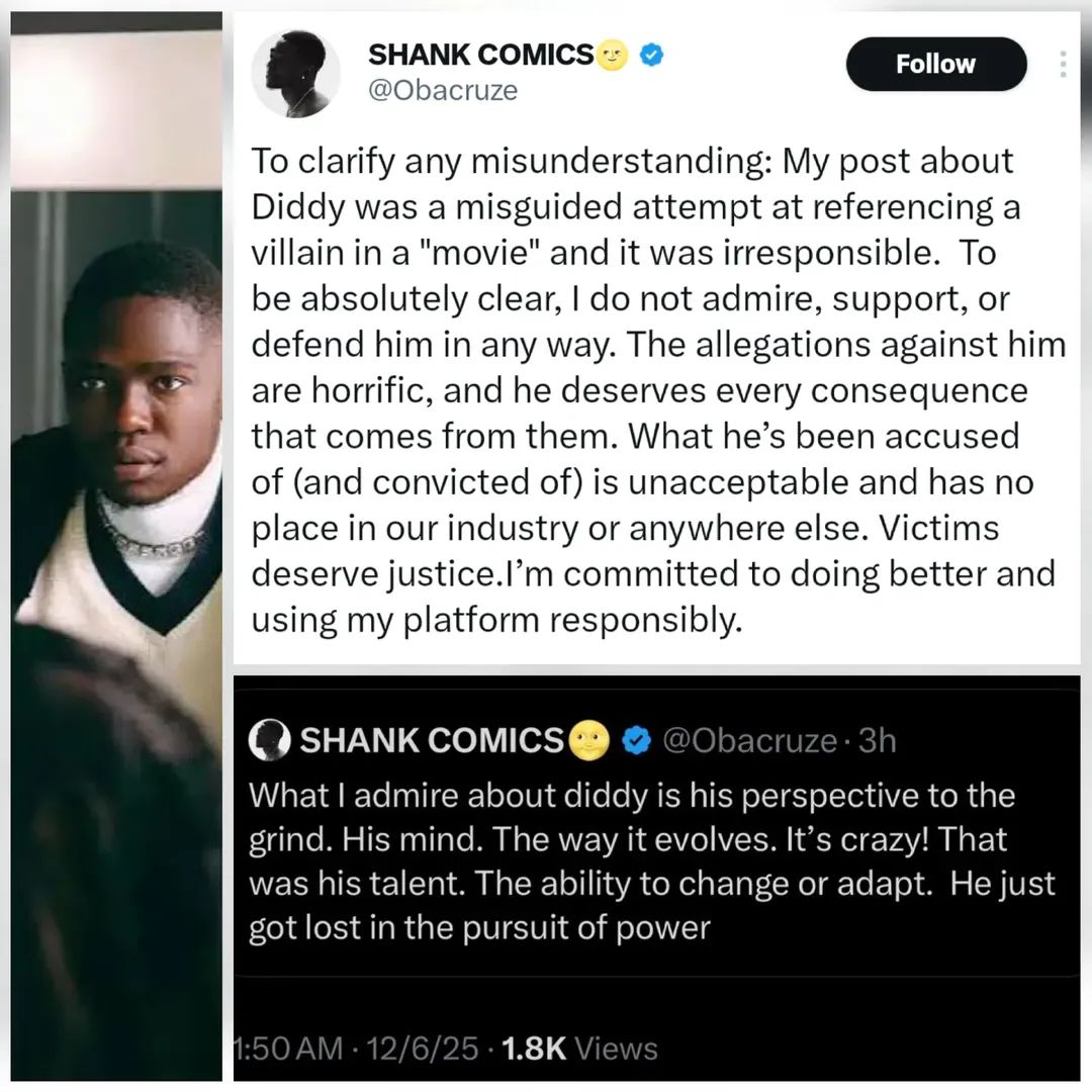 Skitmaker Shank Comics (Adesokan Adedeji Emmanuel) says his post was irresponsible and wrong. He apologised after an old tweet about Diddy resurfaced online.