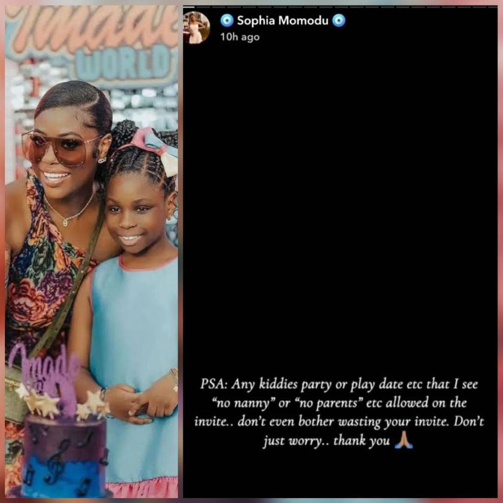 Sophia Momodu has rejected party invites that ban nannies. She says those invites do not suit her daughter Imade. She shared the message in a short Snapchat note.