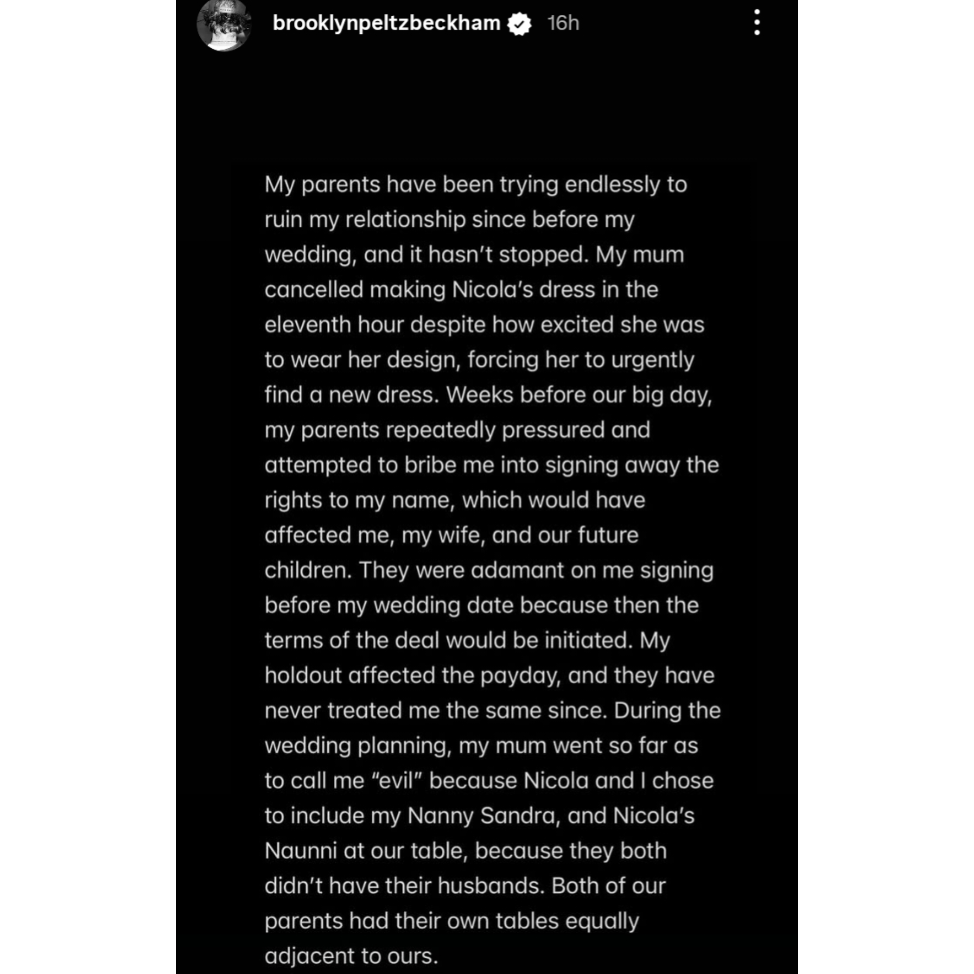 Brooklyn provided specific, damaging details regarding his 2022 wedding to actress Nicola Peltz. He accuses his mother, Victoria Beckham, of trying to ruin the event from the start. According to his statement, the fashion designer cancelled making Nicola’s dress at the “eleventh hour,” forcing the bride to frantically find a replacement.
