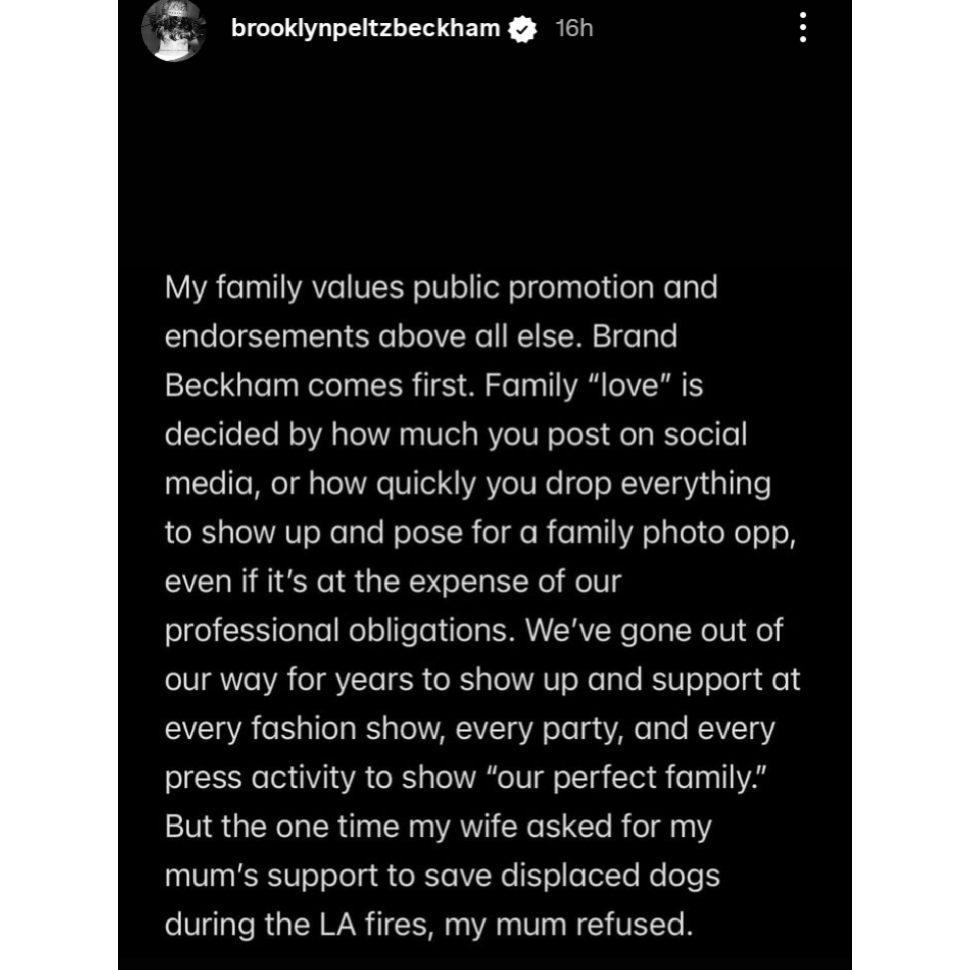 The statement attacks the core of the Beckham empire, describing a family dynamic driven entirely by public relations. Brooklyn asserts that “love” in the family is measured by social media posts and photo opportunities. He claims his parents refused to support Nicola’s request for help saving displaced dogs during the LA fires because it did not serve their brand.