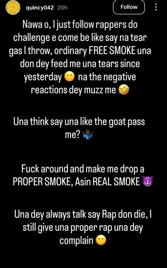 Quincy 042 addressed the backlash following his January 27 diss track against Phyno. The rapper described the song as “free smoke” and criticized industry gatekeepers. He insisted he speaks for the “real streets” and threatened to release a harsher track if provoked further.
