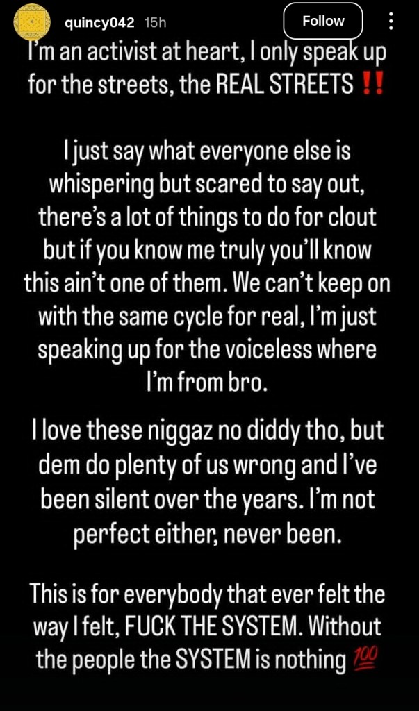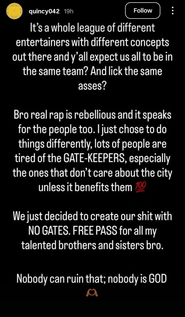 Quincy warned fans not to push him too far. He threatened to drop “real smoke” if the dragging continues.