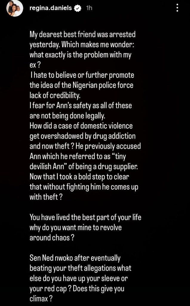 Nollywood actress Regina Daniels has publicly called out her ex-husband, Senator Ned Nwoko, after police officers detained her best friend. The incident occurred on January 12, 2026, marking another escalation in the public dispute between the former couple.
