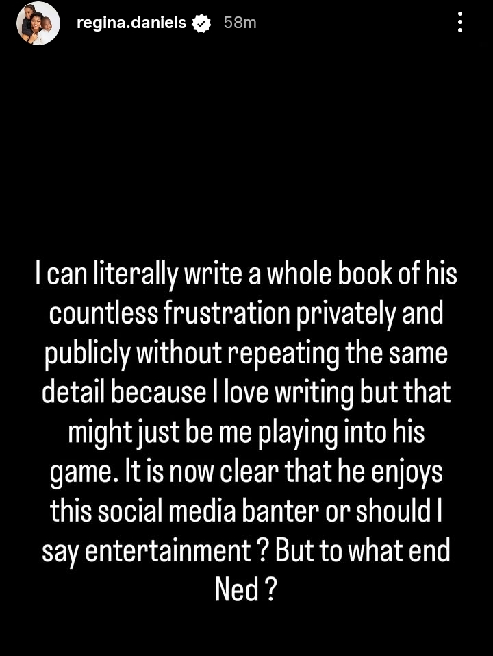 The situation remains tense as Ned Nwoko releases Whatsapp messages claiming the actress often chooses victimhood over resolving issues. Regina insists that these legal maneuvers are not about justice but about causing chaos in her new life.