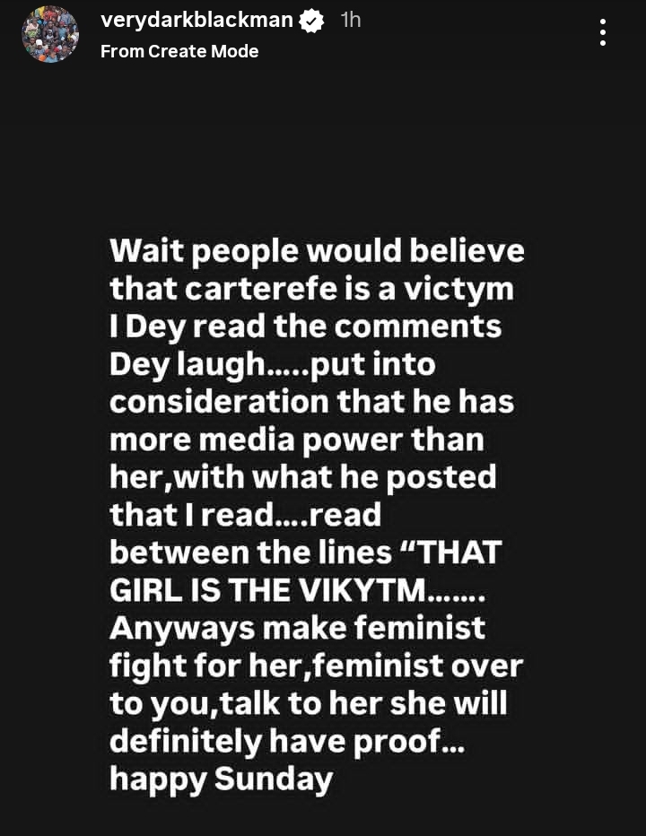 VeryDarkMan took to his Instagram page to address the situation directly. He claimed that reading the supportive comments on Carter Efe’s posts made him laugh, as he believes the reality is quite different.
