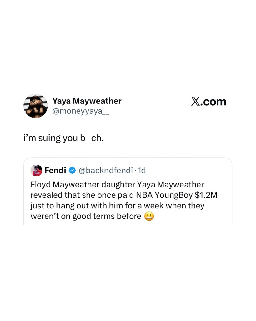 Yaya Mayweather has firmly denied viral rumours claiming she paid NBA YoungBoy $1.2 million to spend a week with her. On January 23, 2026, she threatened legal action on X, asserting the rapper is wealthy and actually supported her financially during their relationship.