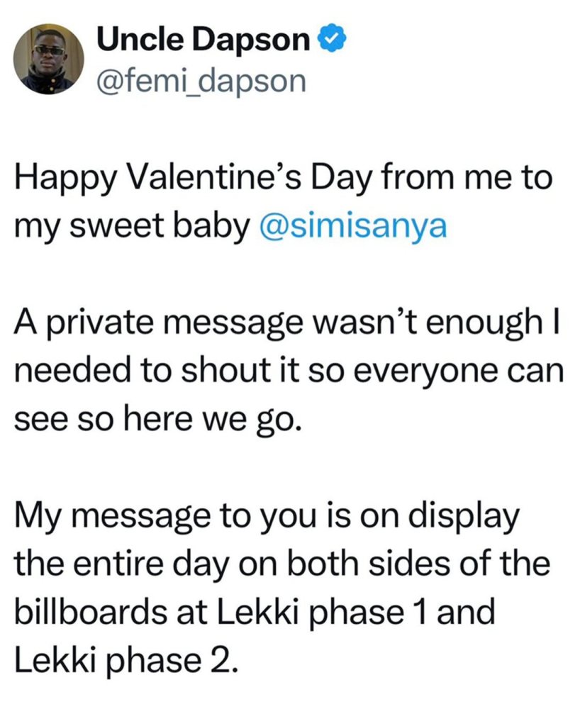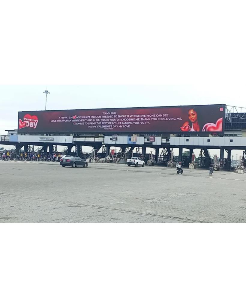 ”TO MY SIMI, A PRIVATE MESSAGE WASN’T ENOUGH. I NEEDED TO SHOUT IT WHERE EVERYONE CAN SEE I LOVE THIS WOMAN WITH EVERYTHING IN ME. THANK YOU FOR CHOOSING ME. THANK YOU FOR LOVING ME. I PROMISE TO SPEND THE REST OF MY LIFE MAKING YOU HAPPY. HAPPY VALENTINE’S DAY MY LOVE. FEMI DAPSON,” the billboard read.