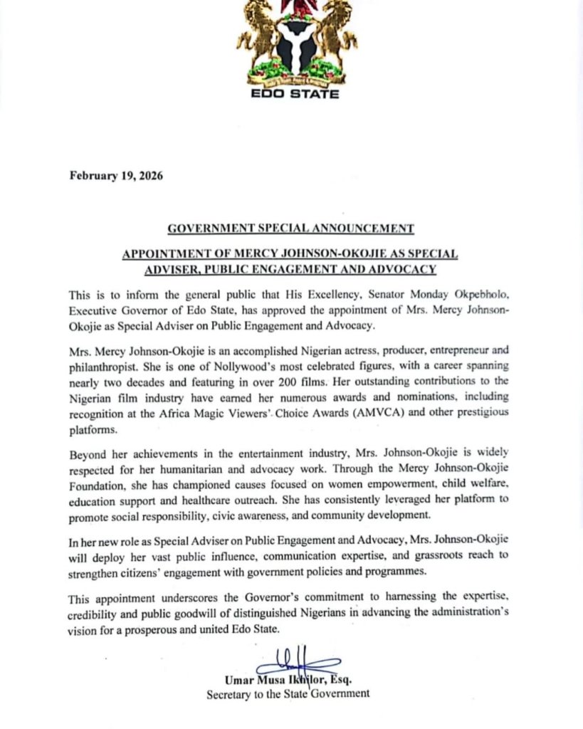 On February 19, 2026, Governor Monday Okpebholo of Edo State appointed Nollywood actress Mercy Johnson Okojie as his Special Adviser on Public Engagement and Advocacy. The actress officially accepted the role, pledging to strengthen civic engagement and support the governor’s SHINE agenda for sustainable development across the state.