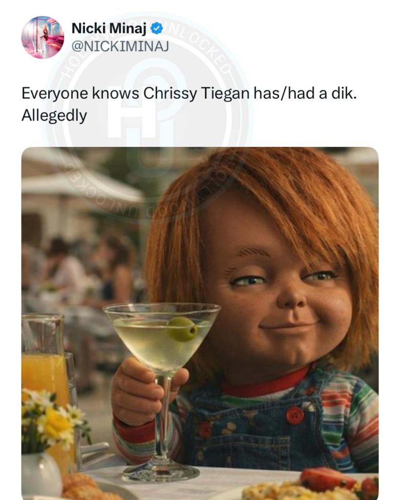 She also directed bizarre claims at model Chrissy Teigen during the spree. The star alleged that Teigen “has/had a” male organ, simply adding “allegedly” to the post.
