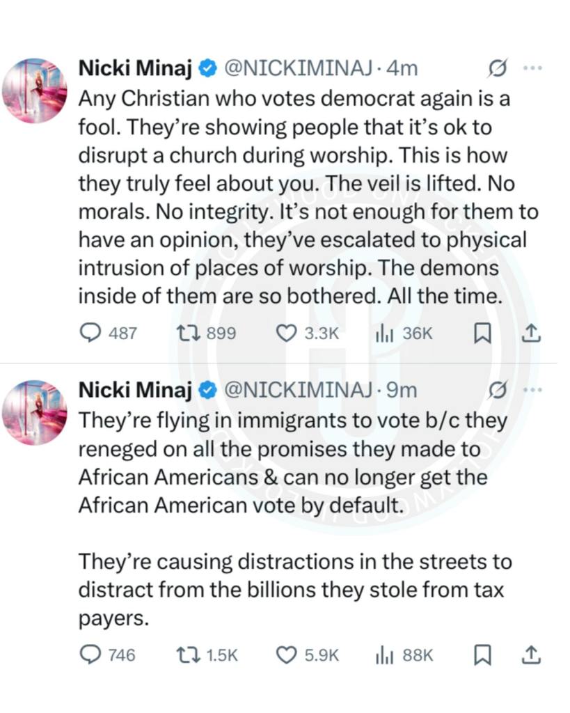 She accused the party of flying in immigrants to replace Black voters. Minaj argued they reneged on promises and can no longer get the “African American vote by default.”
