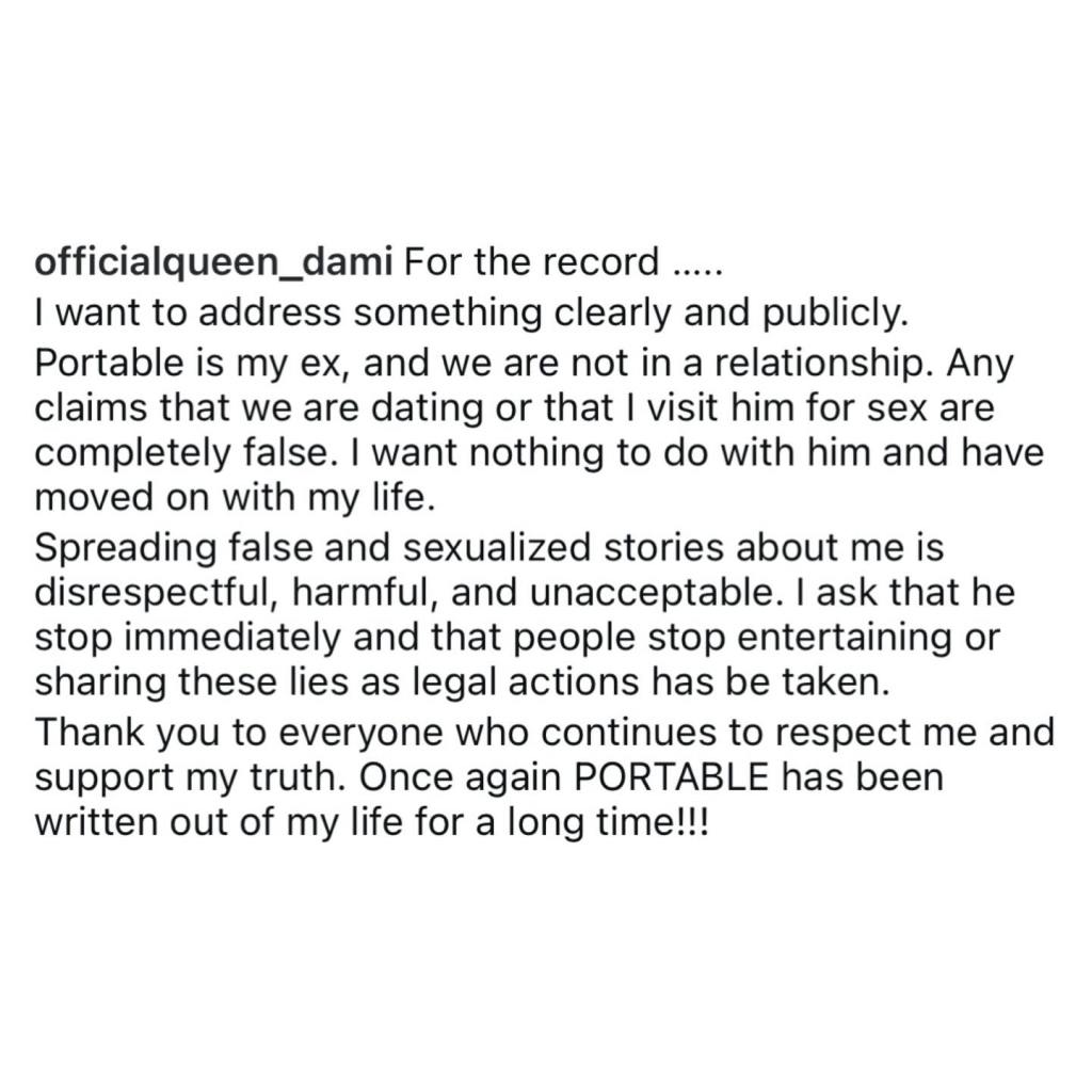 She concluded her statement by thanking those who support her truth. Dami emphasized that Portable has been “written out” of her life for a very long time.