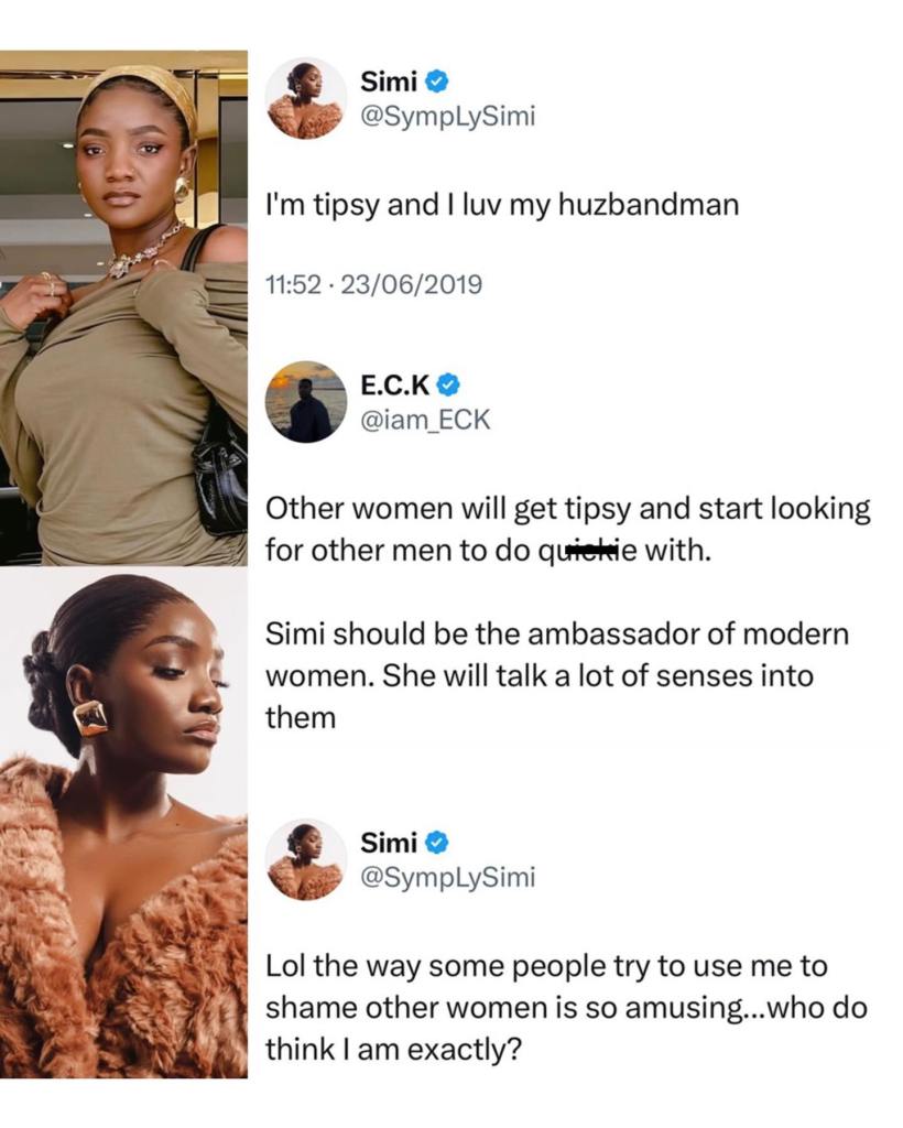 However, E.C.K used this sentiment to attack other women. He claimed others would seek a “quickie” with different men when intoxicated, unlike Simi.
